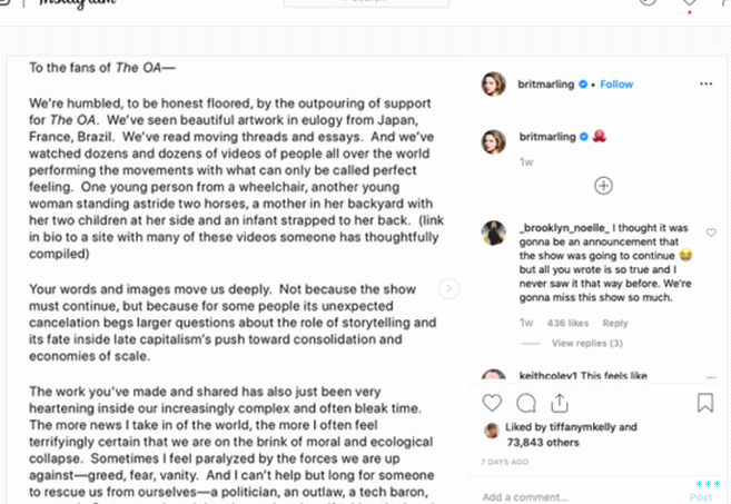 स्पष्ट होने के लिए, एक Change.org याचिका भी है। लगभग 80,000 5 अगस्त को नेटफ्लिक्स के शो को रद्द करने के बाद से लोगों ने इस पर हस्ताक्षर किए हैं। लेकिन ऐसे समय में जब ट्विटर ब्रुकलिन नाइन-नाइन जैसे शो को बचा सकता है, जैसे ही फॉक्स ने इसे गिराया, एनबीसी ने इसे लगभग बंद कर दिया OA के प्रशंसकों को बचाने के लिए सबसे अधिक लंबाई की तुलना में अधिक से अधिक लंबाई जा रहे हैं उनके पसंदीदा कार्यक्रम। इससे टीवी की गहरी समझ का पता चलता है अब काम करता है। OA भक्त, जैसा कि उनके प्रचार से स्पष्ट है अभियान और विरोध प्रदर्शन, जानते हैं कि नेटफ्लिक्स जैसी कंपनी है मुख्य रूप से दर्शक संख्या से प्रेरित है। वे स्ट्रीमिंग को मानते हैं विशाल अपने शो का प्रचार करने के लिए पर्याप्त नहीं थे, इसलिए वे ऐसा कर रहे हैं खुद को।